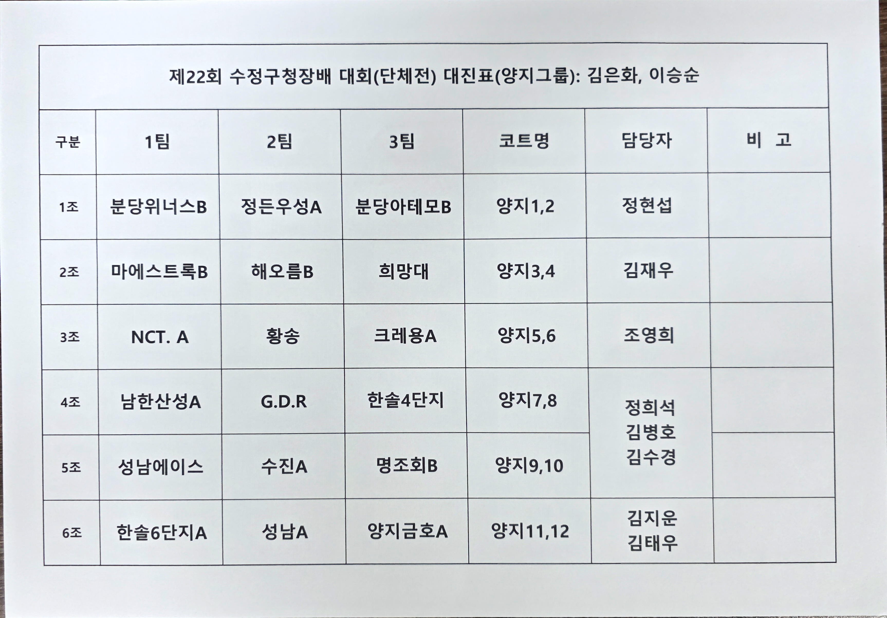 10월26일(일) 단체전(양지그룹)참가하는 선수들께서는 8시50분까지 대진표의 해당 경기장으로 오셔서 출전신고 하시기바랍니다.