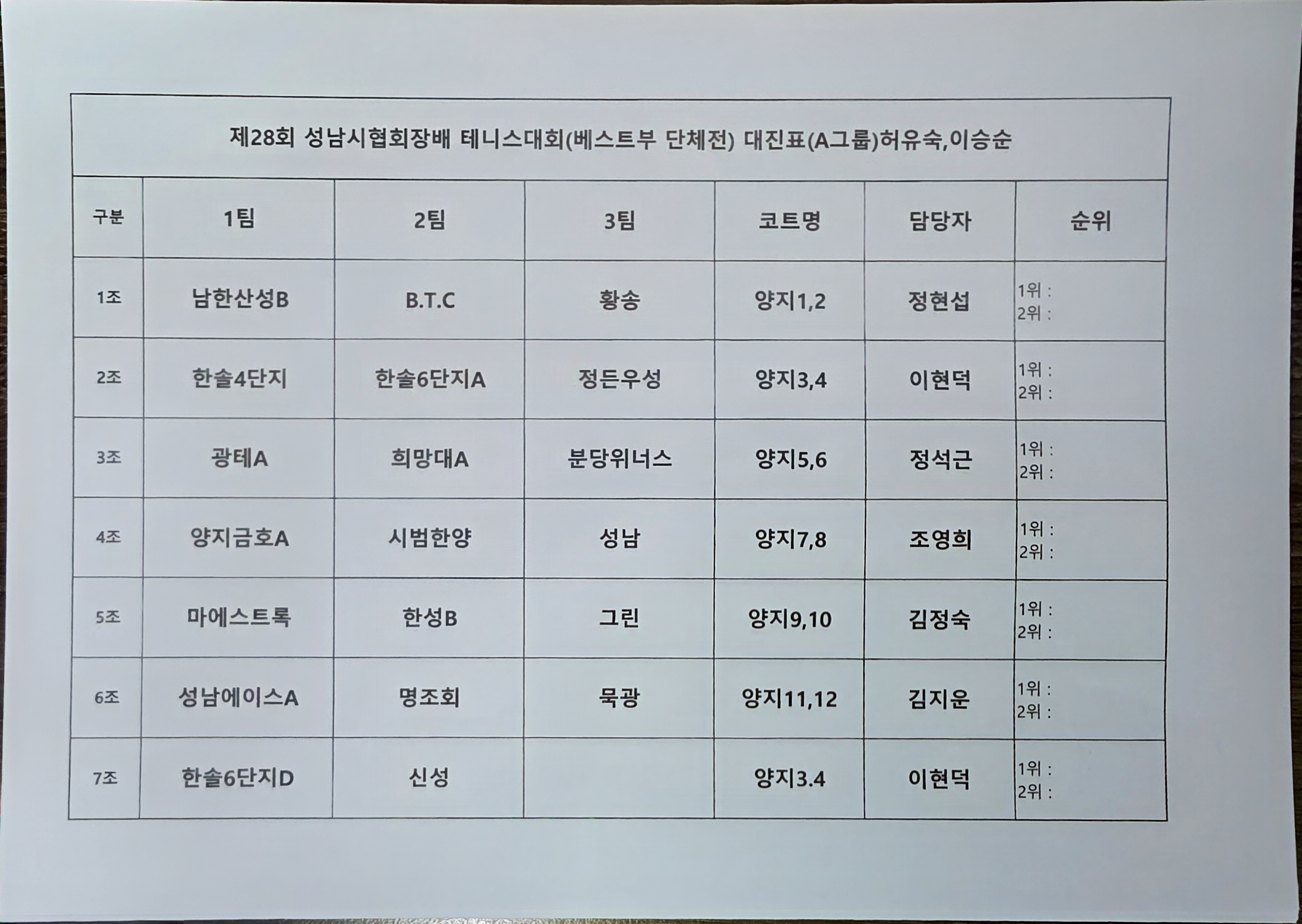 ◇제28회 성남시협회장배 베스트부 단체전A그룹 대진표 안내◇