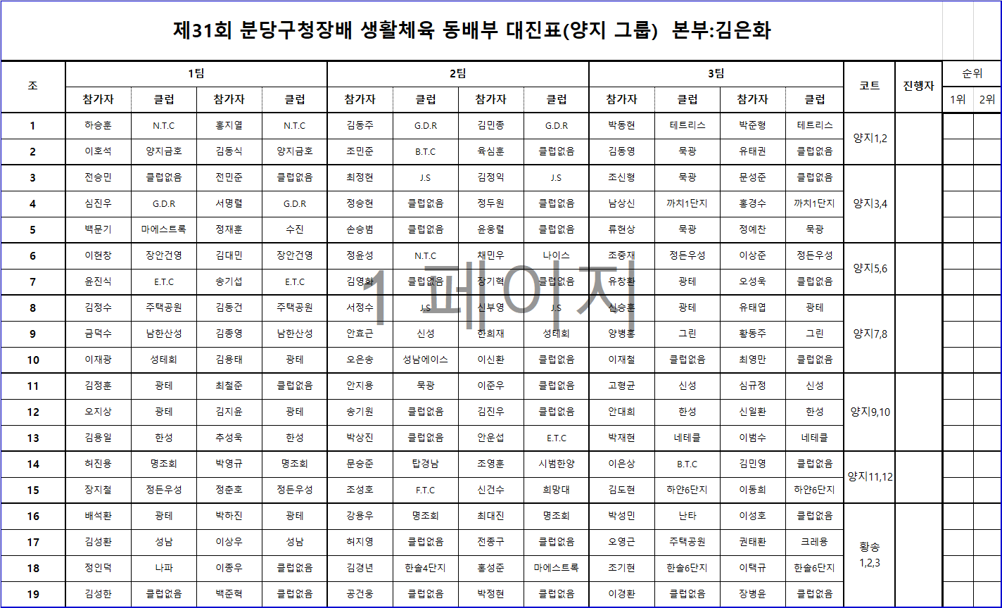 제31회 분당구청장배 동배부 대진표(양지그룹)입니다.