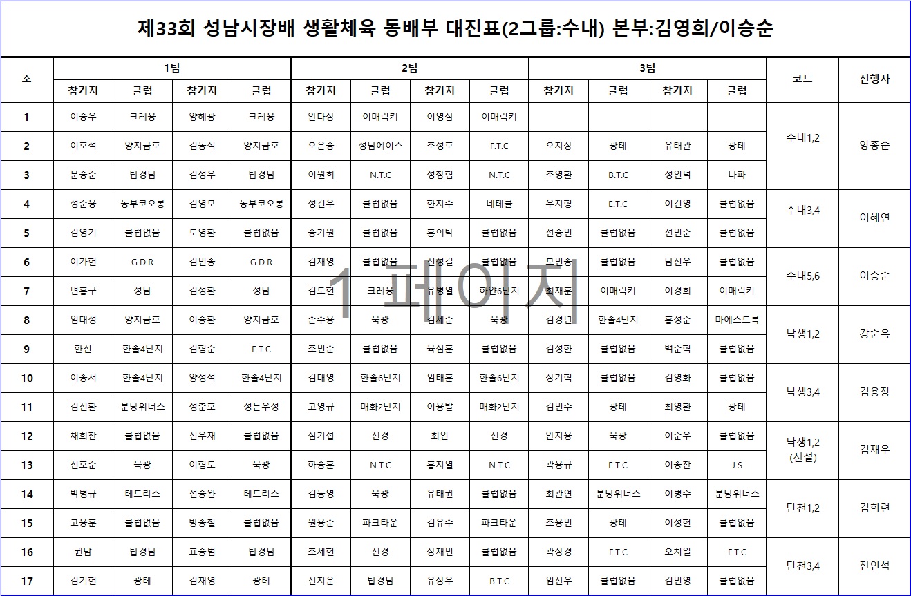 제33회 성남시장배 동배부(수내) 대진표입니다.