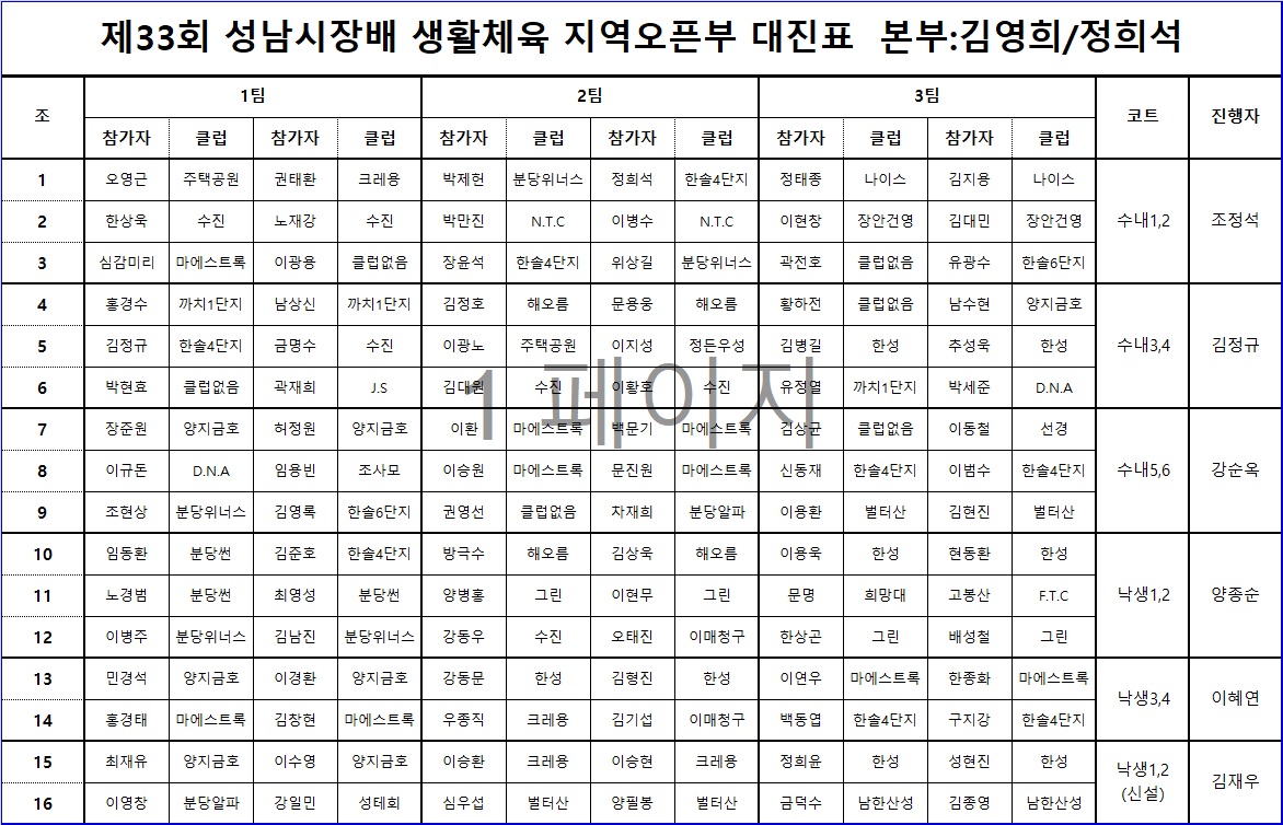제33회 성남시장배 지역오픈부 대진표입니다.