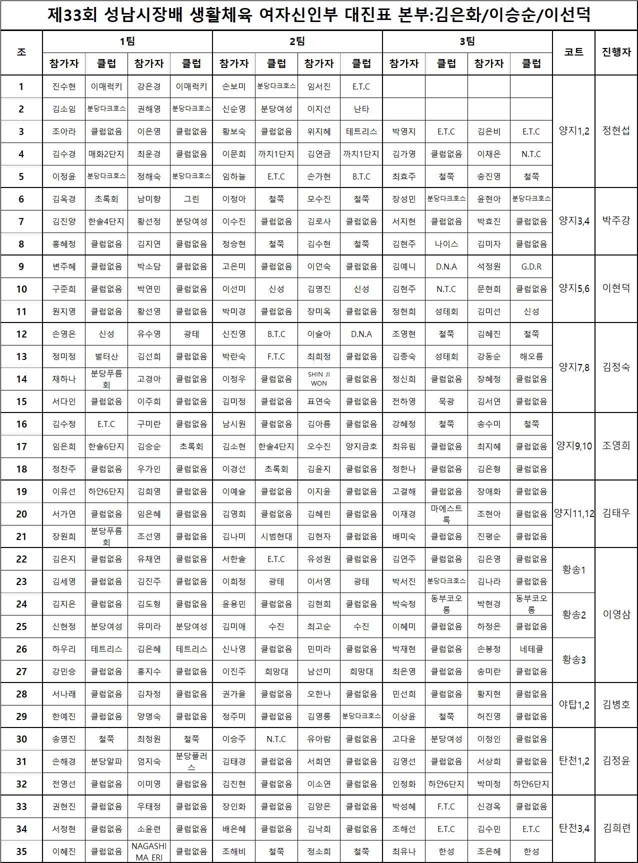 제33회 성남시장배 여자신인부 대진표입니다.